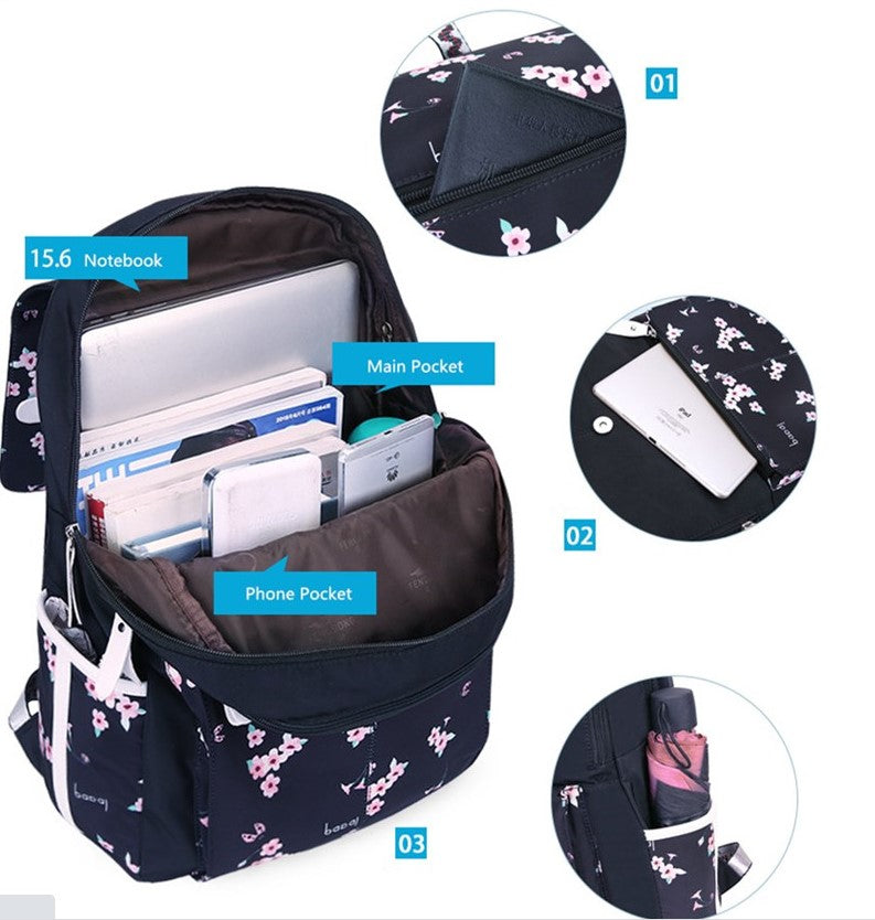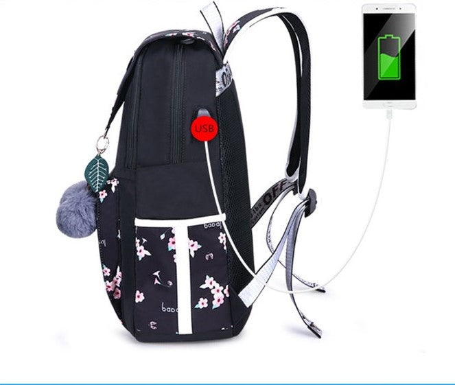 Удобна, стилна, здрава и много красива раница за момиче, на която всеки ученик би завидял. Раницата е с изключително красив принт и високо качество на изработка. Подходяща е за всички възрасти момичета. Включено е USB зареждане, с което да зареждате телефона си, където и да сте. Просто включете power bank (не е включен в комплекта) и телефона си отвън и ще имате батерия навсякъде.